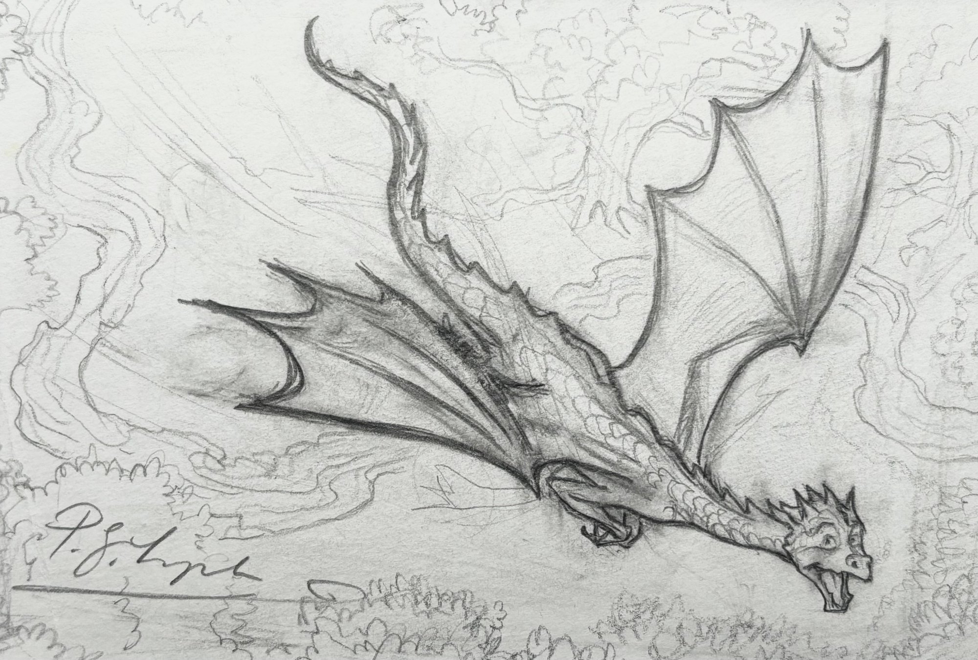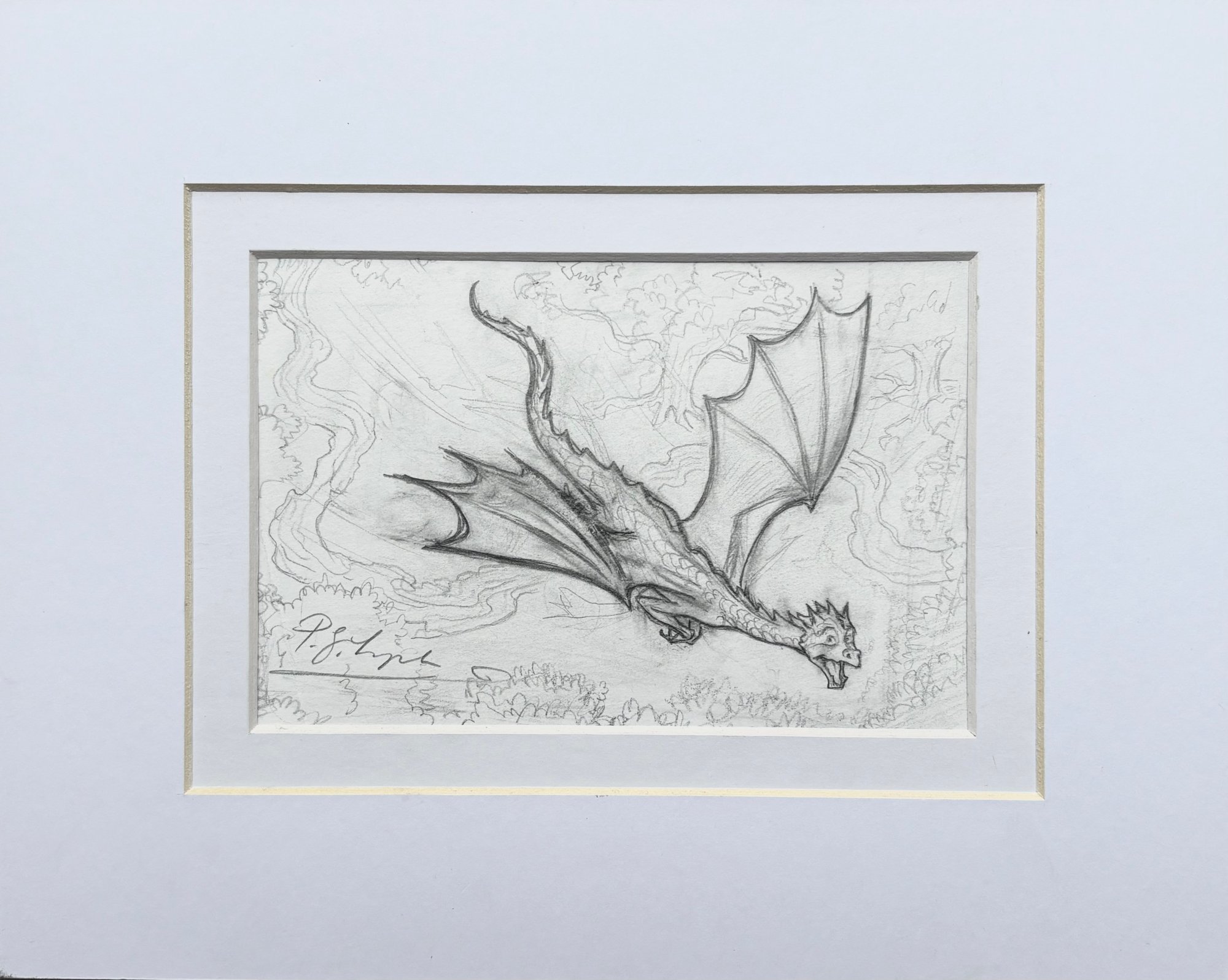 This signed pencil drawing of Ignis in full flight is presented in an attractive iced white and ivory double mount and it measures approximately 10 x 14 cm cm whilst the outer dimensions of the mount are 20 x 25 cm approximately.