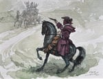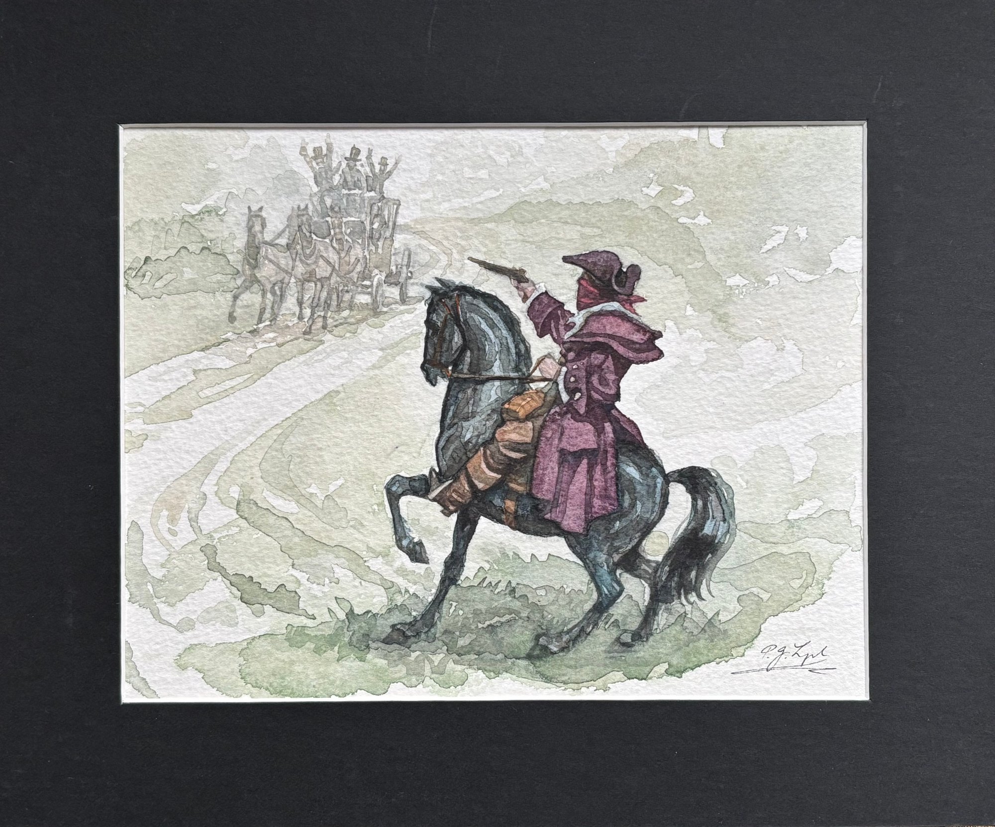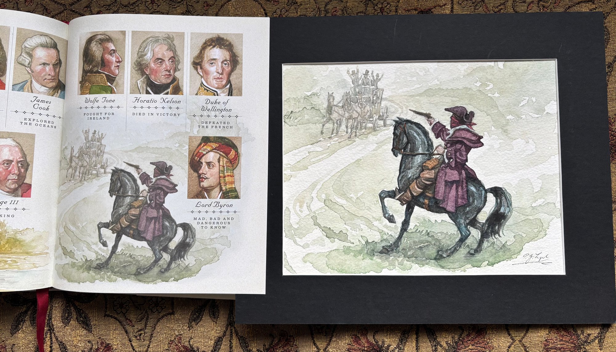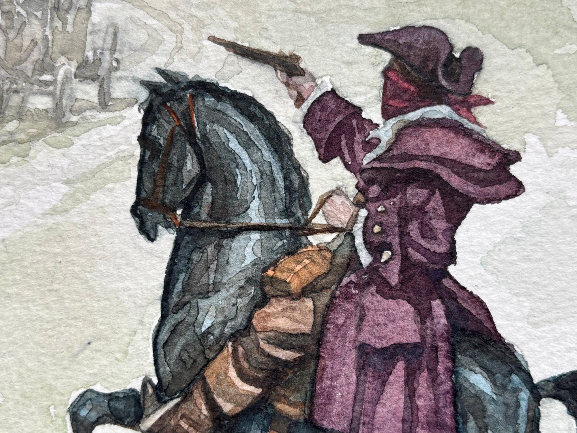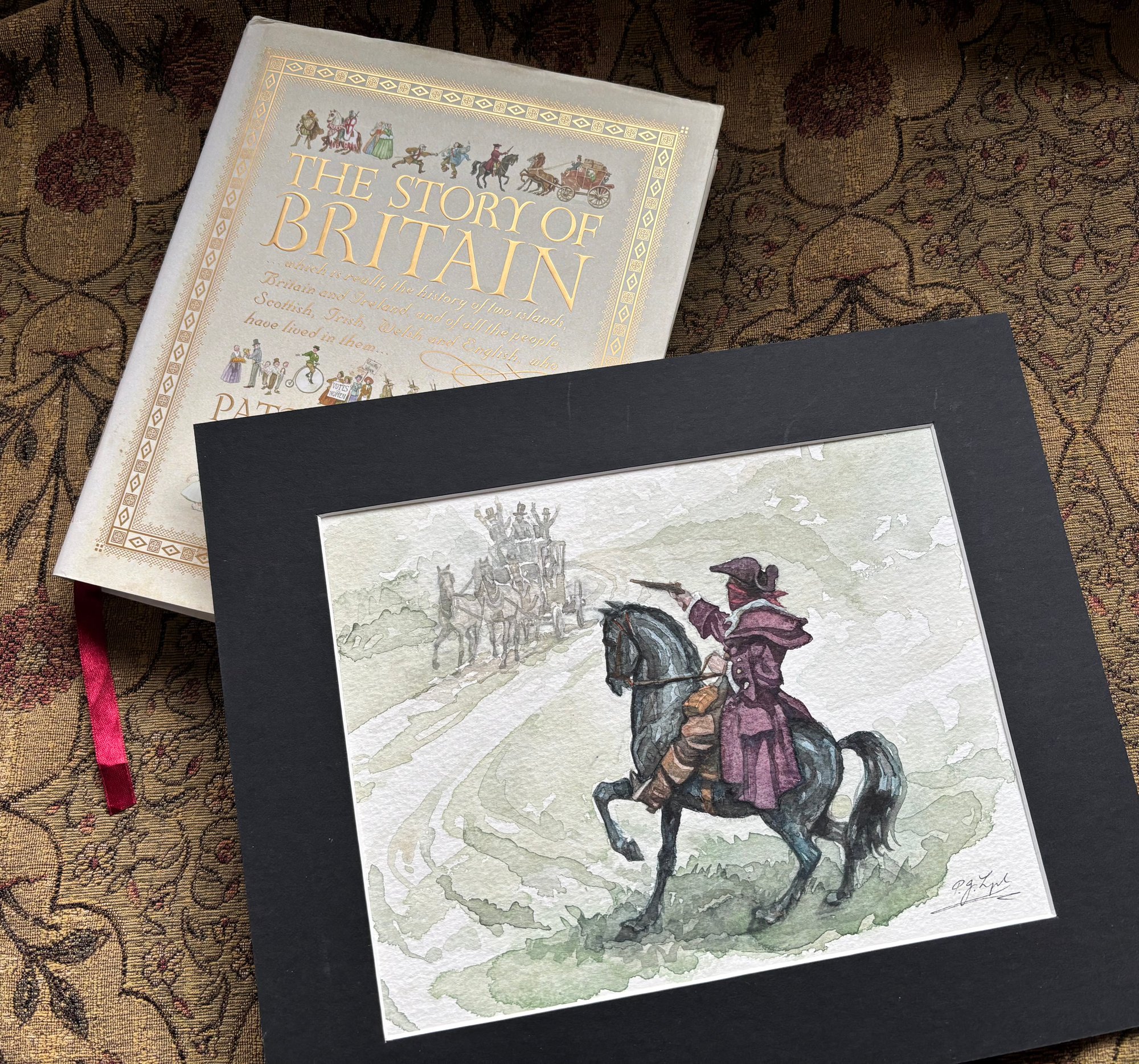This watercolour painting by PJ Lynch shows an eighteenth century highwayman plying his wicked trade.