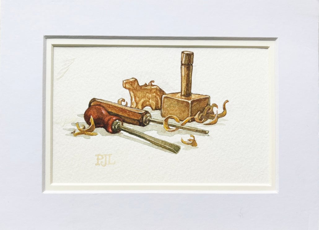 This original painting shows Jonathan Toomey's mallet and chisels with one of his sheep partly carved. I comes from the spread in the book where we are introduced to the wood carver's workshop.